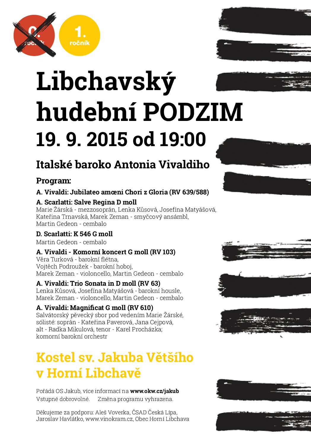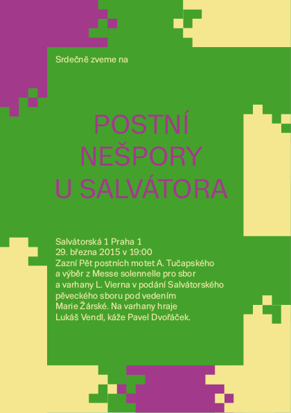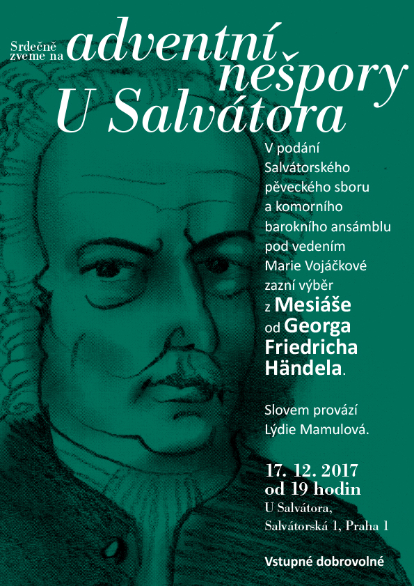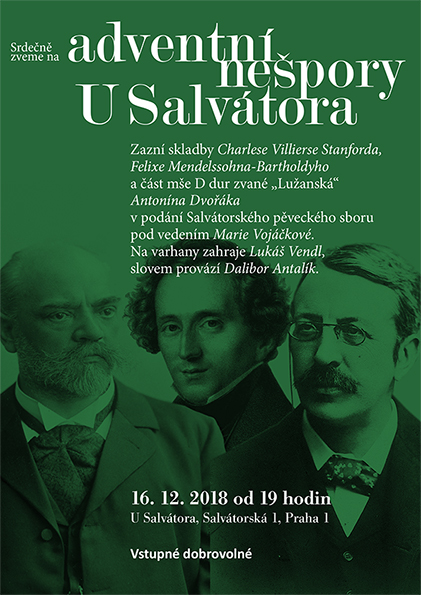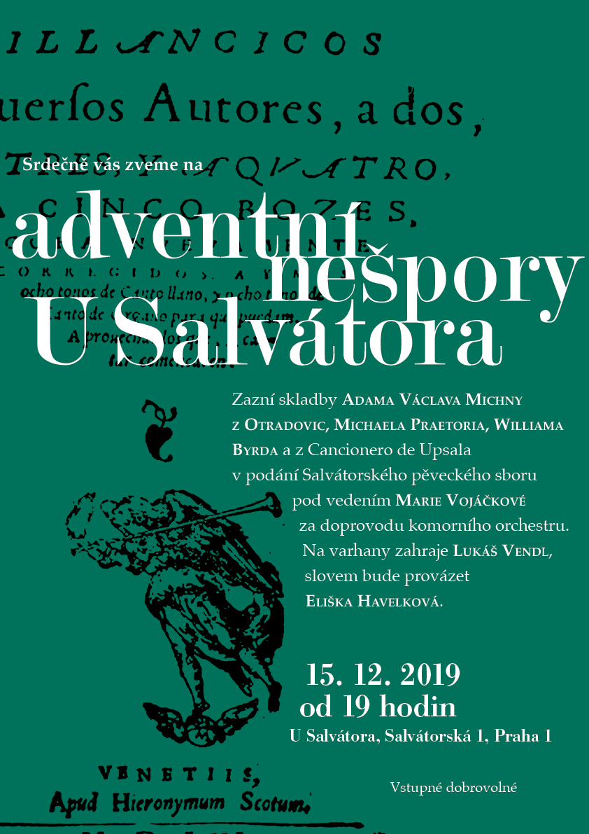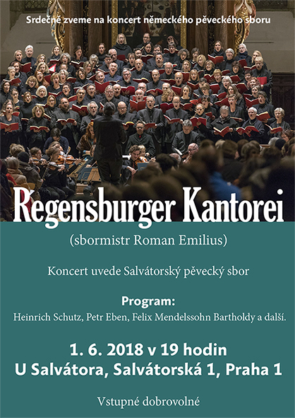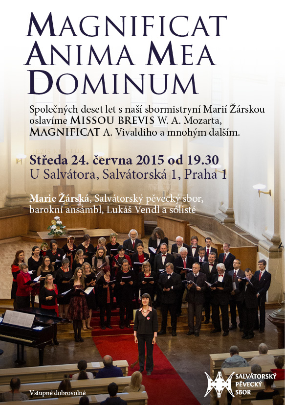 05. 04. 2020 19h - postní nešpory U Salvátora 05. 06. 2020 - Noc kostelů U Salvátora 15. 12. 19h 2019 - kostel U Salvátora - adventní nešpory 1. 12. 16:30-17h 2019 - adventní charitativní trh pro Sdružení Neratov 24. 11. 17h 2019 - klášter Karla Boromejského v Řepích - W. A. Mozart - Requiem 31. 10. 19h 2019 - kostel U Salvátora - Vystoupení v rámci koncertu Světlo porozumění 27. 10. 17h 2019 - Bergneustadt - výběr z Mozartova Requiem 24. 5. 2019 - 19:30 Noc kostelů U Salvátora 14. 4. 2019 - 19h - Salvátorské nešpory s výběrem z Matoušových pašijí J. S. Bacha 16. 12. 2018 19:00 - Adventní nešpory U Salvátora 2. 12. 2018 10:30 - Zpěv při bohoslužbách U Salvátora 24. 11. 2018 - Společný koncert se slovenským sborem v Bratislavě 7. 10. 2018 14:00 - Zpívání na střeše Lucerny při mši 24. 9. 2018 Zpívání při křtu knihy v Lucerně 16. 9. 2018 14:30 - Zpívání při Instalaci faráře kostela U Salvátora 30. 8. 2018 - 2. 9. - Soustředění v Příchovicich 1. 6. 2018 19h Společný koncert se sborem z Regensburgu U Salvátora. 25. 5. 2018 19h Noc kostelů 20. 5. 2018 9:30 svatodušní neděle – zpívání při bohoslužbách 19. 5. 2018 16:30h Koncert v rámci festivalu Otevřené zahrady v Libčicích. 25. 3. 2018 19h Postní nešpory 18. 2. 201809:30 1. postní neděle -zpívání při bohoslužbách 17. 12. 2017 19h adventní nešpory U Salvátora 28. 10. 2017 19h - koncert v rámci Libchavského hudebního podzimu 26. 6. 2017 19h - koncert U Salvátora spolu se švédským sborem Huddinge kammarkör 10. 6. 2017 20h - A. Dvořák Lužanská u Martina ve Zdi s Kantorei Bergneustadt 9. 6. 2017 19:30 - Noc kostelů U Salvátora 20.-21. 5. 2017 - Festival duchovní hudby v Lamu a Bad Kötzting 9. 4. 2017 - Postní nešpory U Salvátora s hudbou H. Purcella a D. Buxtehudeho 11. 12. 2016 v 19:00 - Adventní nešpory U Salvátora 27. - 30. 10. 2016 - Zahraniční výlet a koncert v Bergneustadt 25. - 28. 8. 2016 - Letní soustředění v Příchovicích (výročí desátého soustředění) 10. 6. 2016 20:00 - Noc kostelů 20. 3. 2016 19:00 - Postní nešpory U Salvátora s hudbou J. S. Bacha (BWV 6 a závěrečné sbory z pašijí) 14. 2. 2016 9:30 - Zpívání při ranních bohoslužbách 19. 09. 2015 - koncert v rámci festivalu Libchavský hudební podzim 24. 06. 2015 19:30 - Výroční koncert v kostele U Salvátora 29. 05. 2015 - Vystoupení U Salvátora v rámci Noci kostelů 2. 05. 2015 - společný koncert s německým sborem KantoreiBergneustadt 29. 03. 2015 19:00 U Salvátora - postní nešpory - A. Tučapský - Pět postních motet (k výročí narození skladatele, který roku 2014 zesnul); L.Vierne - výběr ze mše pro smíšený sbor a varhany. 15. 01. 2015 U Salvátora - benefiční koncert - Skladby evropské reensance a A Ceremony of Carols B. Brittena 13. 10. 2013 18:00 společný koncert se sborem ze Světlé nad Sázavou14. 12. 2014 19:00 U Salvátora - evropská renesance - adventní nešpory 5. 10. 2014 9:30 U Salvátora - H.Schütz - Magnificat (SWV 468) Při slavnostních bohoslužbách k oslavě 400 let od postavení chrámu 29. 9. 2013 9:30 část z BWV 146 v rámci bohoslužeb 3. 11. 2013 9:30 D. Buxtehude - Jesu meine Freude v rámci bohoslužeb 12. 12. 2013 19:30 Benefiční koncert v Emauzích - A Ceremony of Carols od B. Brittena 15. 12. 2013 19:00 adventní nešpory - večerní bohoslužby s hudbou (T. Tallis a B. Britten)24. 3. 2013 19:00 - květná neděle - nešpory U Salvátora 2. - 5. 5. 2013- vystoupení v Magdeburgu 8. 6. 2013 9:30 - 13:00 - vystoupení v rámci vzpomínkového sjezdu exulantů pro víru U Salvátora 29. 8. - 1. 9. 2013 - letní soustředění v Příchovicích 16. 12. 2012- adventní nešpory U Salvátora- F. Poulenc - Vánoční moteta - 19:00 16. - 19. 8. 2012 - soustředění v Příchovicích - zpívání na výročí rozhledny Štěpánky a v kostele v Kořenově 2. - 3. 6. 2012 - koncerty v rámci festivalu duchovní hudby na Klatovsku 20. 5. 2012 - společný koncert se Scandulou v Praze; W. A. Mozart - Missa brevis in G - 19:30 15. 4. 2012 - společný koncert se Scandulou v Libčicích n.Vlt.; W. A. Mozart - Missa brevis in G - 18:00 1. 4. 2012 - postní nešpory U Salvátora - výběr z responsorií T. Luise de Victoria - 19:00 11. 12. 2011 - adventní nešpory U Salvátora - skladby Dietricha Buxtehudeho - 19:00 18.-21.8.2011- Letní soustředění v Příchovicích 5.6.2011-Vystoupení v rámci bohoslužeb U Klimenta s výběrem z díla Messe solenelle L.Vierna 17.4.2011-Salvátorské nešpory-večerní bohoslužby U Salvátora s hudbou-zazní Music for the Funeral of Queen Mary H.Purcella a Messe solennelle L.Vierna-19:00 14.11.2010 - Vystoupení v rámci Oslav 65.výročí od založení sboru v Předhradí-14:30 12.12.2010 - Salvátorské nešpory- večerní bohoslužby s hudbou-zazní Magnificat Antonia Vivaldiho-19:00 |