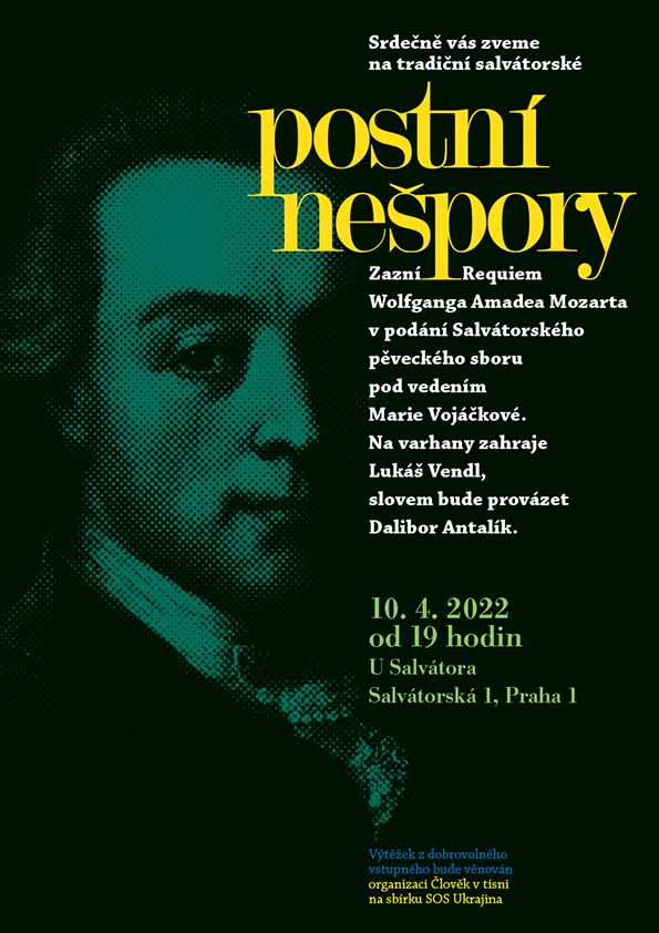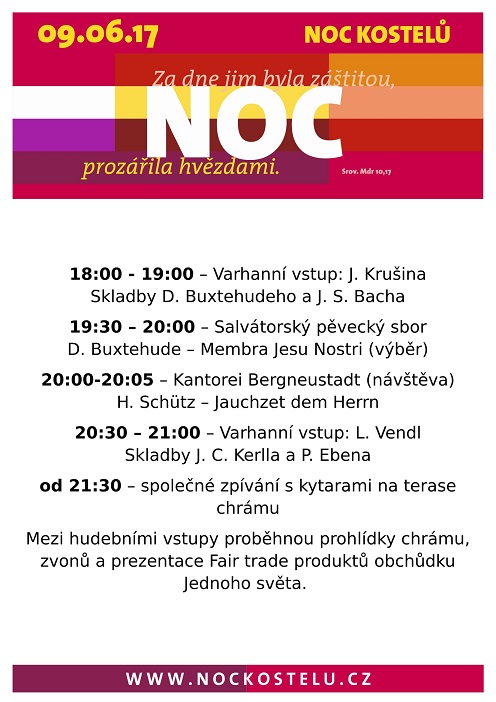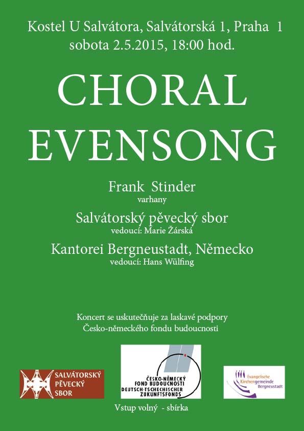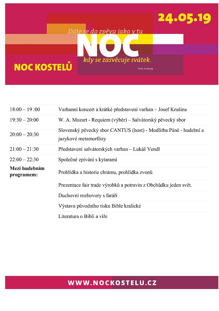 10.04. 2022 19h - postní nešpory U Salvátora 28.05. 2022 17h - koncert s Kantorei Bergneustadt 10.06.2022 - Noc kostelů 05. 04. 2020 19h - postní nešpory U Salvátora 05. 06. 2020 - Noc kostelů U Salvátora |